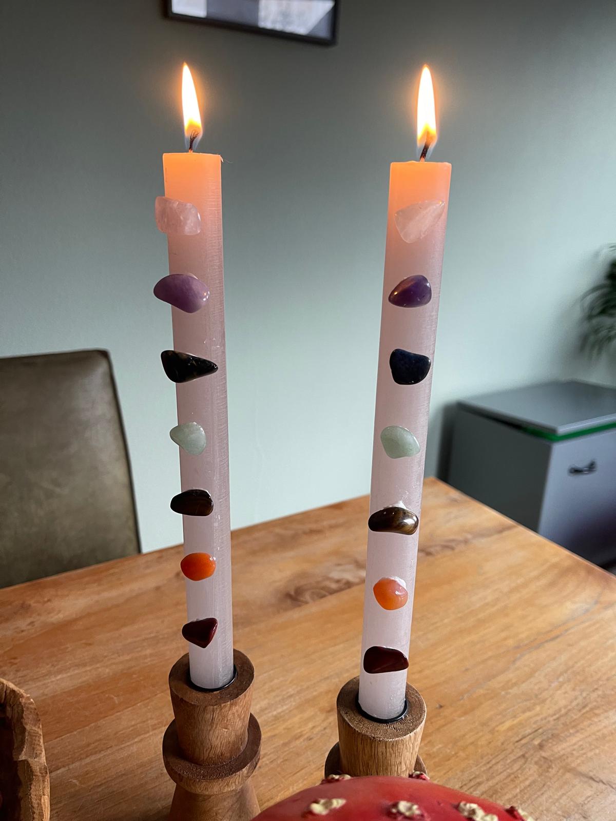 Verhoog de sfeer in huis met deze prachtige dinerkaarsen, verrijkt met chakra edelstenen. Deze handgemaakte kaarsen zijn niet alleen mooi voor het oog, maar ook een krachtige bron van energie. Elke kaars bevat zorgvuldig geselecteerde edelstenen die zijn afgestemd op de zeven chakra’s van het lichaam, om balans, rust en positieve energie te bevorderen.
